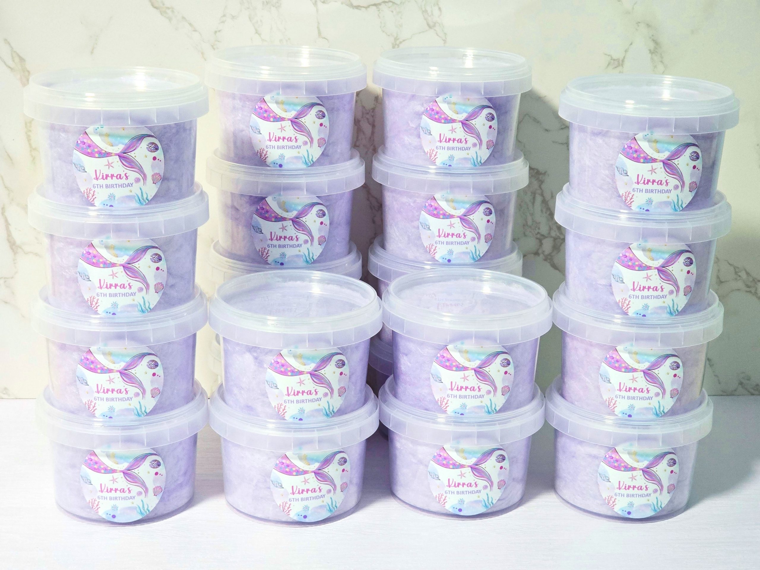 Our Personalised Fairy Floss Party Favour tubs are a fun, sweet and delicious party favour, perfect for adding a special touch to any celebration. Light, fluffy and beautifully presented, each tub is filled with soft fairy floss and finished with a personalised label to match your theme. They’re part of our popular Birthday party favour range, loved by kids and guests of all ages.